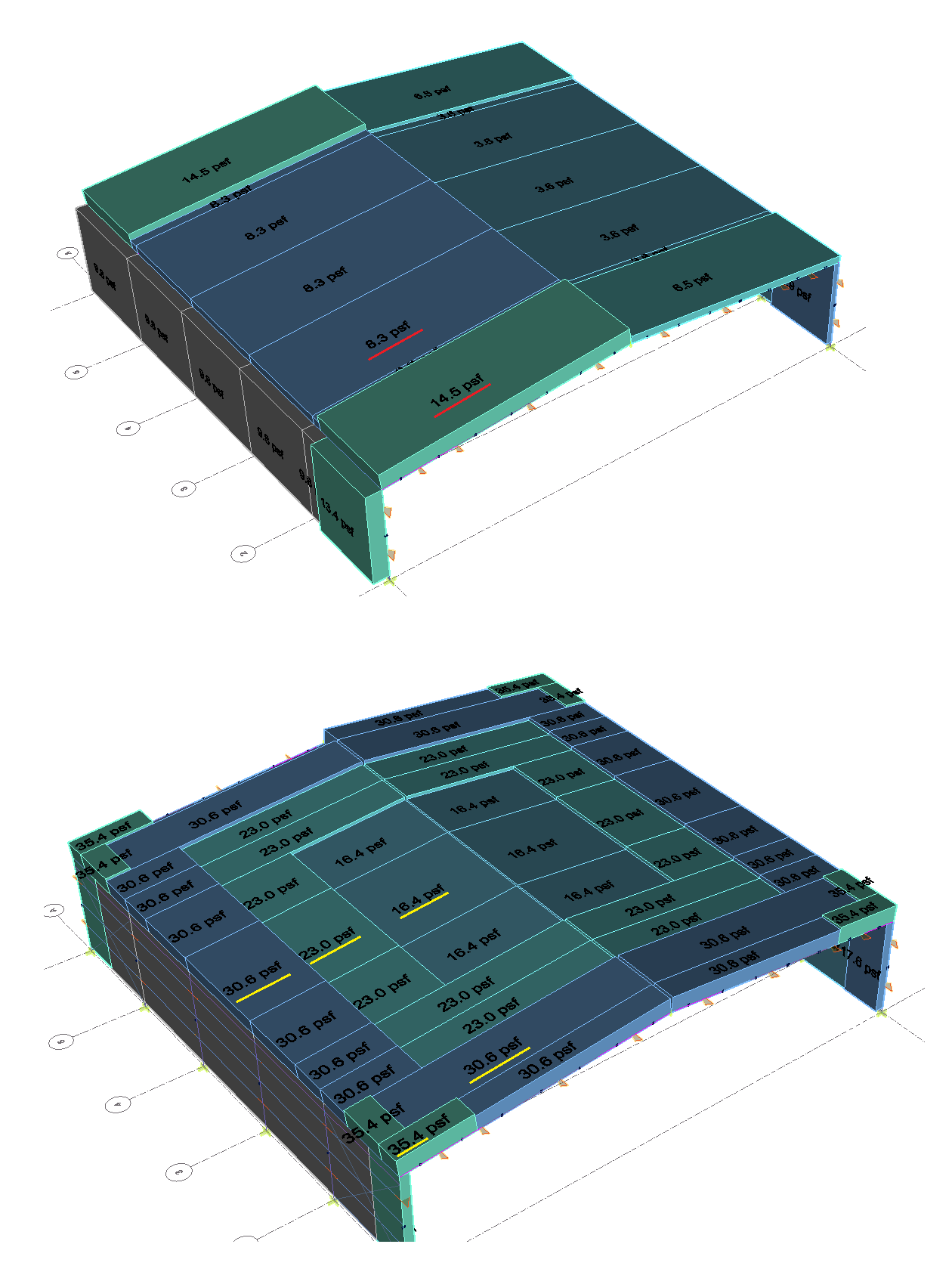 While this simplification reduces calculation effort, it can produce unreliable and noncompliant designs. If the lower (minimum) suction/pressure is applied uniformly, members located in higher-demand zones (e.g., edge/corner regions) may be underdesigned, resulting in an unsafe and noncompliant design. Conversely, if the higher (maximum) pressure is applied uniformly, most members are designed for demands they will not experience, leading to unnecessary conservatism and overdesign.
