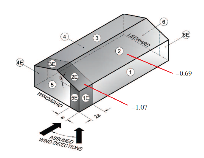 As mentioned the values are different in different parts of the surfaces. For a given example, the two specified region of the buildings have different external pressure coefficients -0.69 and -1.07 (55% more than -0.69) on MWFRS.