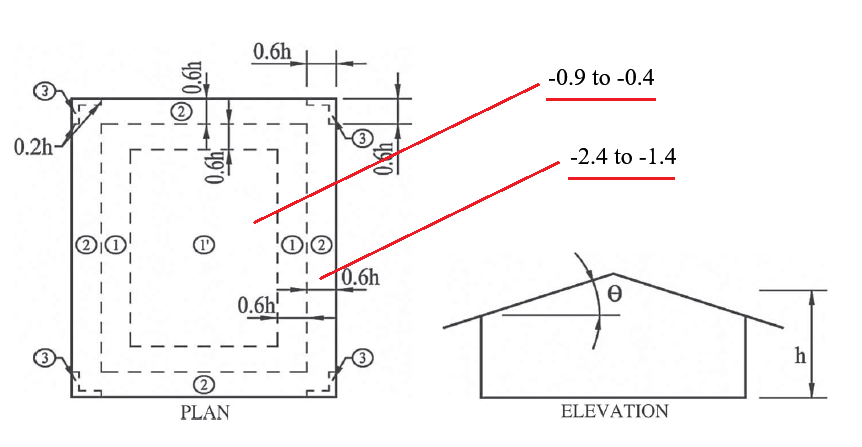 Similarly, for Components and Cladding (C&C) wind loads, different regions of the building surfaces may have different ranges of external pressure coefficients depending on the effective wind area. For example, two specified regions of a building may have coefficient ranges of −0.9 to −0.4 and −2.4 to −1.4, respectively.