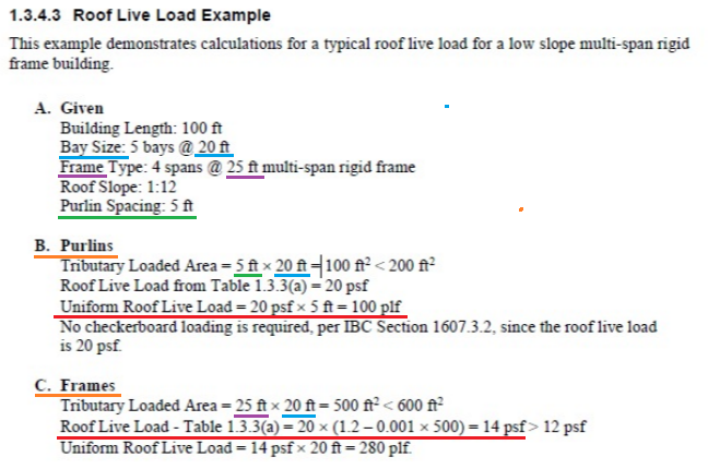 Since the tributary loaded area of frames is often greater than 600 ft², the roof live load is typically reduced to 12 psf for frame design. In contrast, because the tributary loaded area of purlins is often less than 200 ft², the roof live load typically shall not be reduced and should be taken as 20 psf for purlin design.