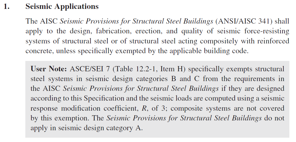 Seismic Provisions for Structural Steel Buildings, AISC 341-22 [3], published by the American Institute of Steel Construction, specifies requirements. However, according to AISC 360-22 [2] some structures do not need to meet the requirements of these provisions, as stated below: