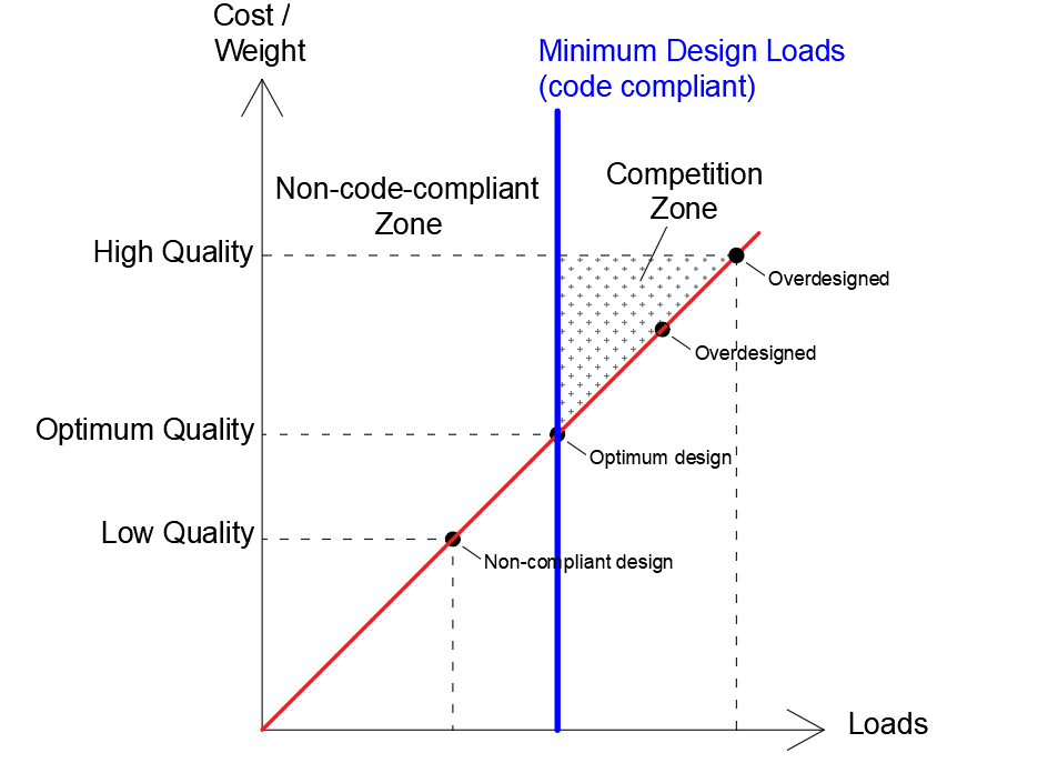 The optimal structural design lies between these two extremes. In this region, the design uses exactly the loads required by the design codes and the structural members are selected so that the building satisfies all safety and serviceability requirements with minimum material usage. Achieving this balance between safety and economy requires both accurate load application and efficient structural optimization.