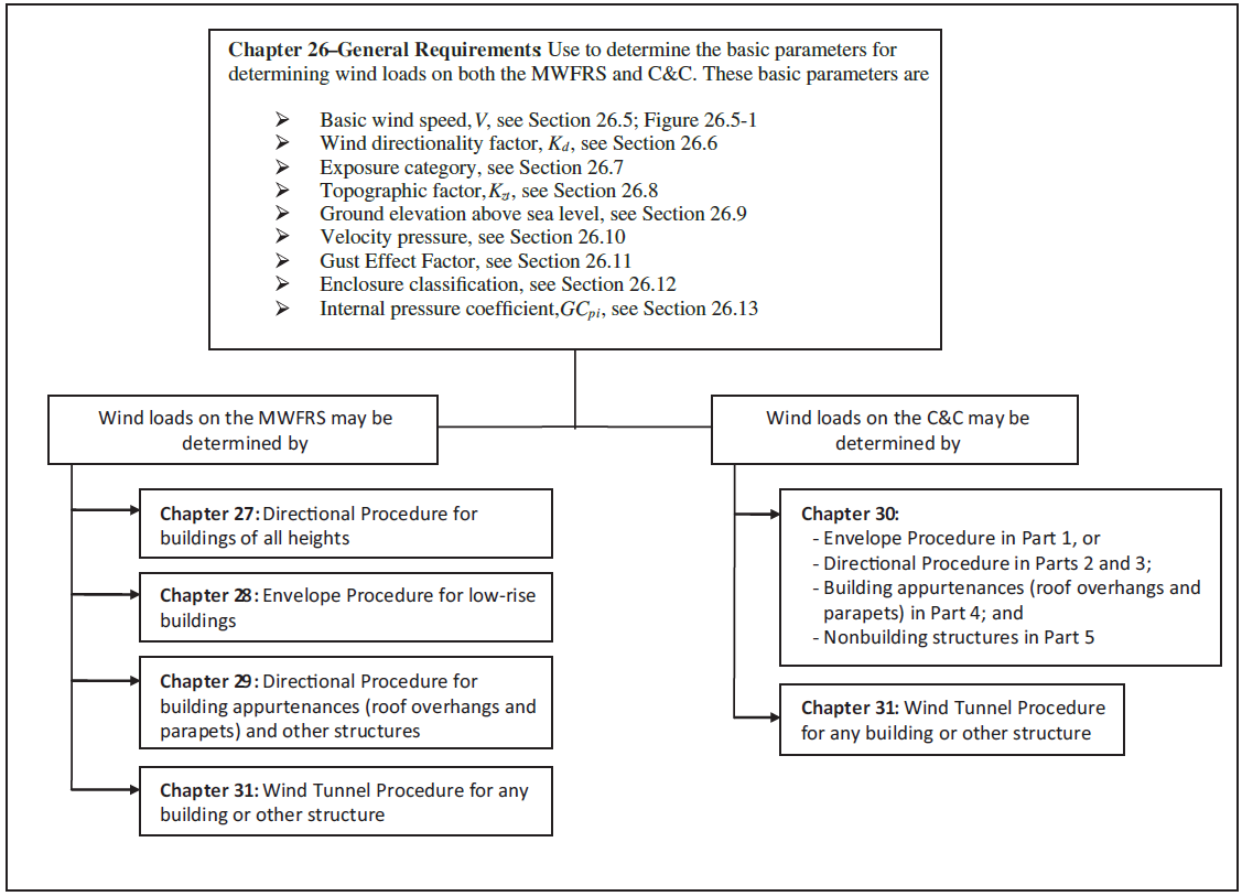 ASCE-07-22 [1] presents wind load determination procedures on MWFRS mainly in Chapter 27 (Directional Procedure) and Chapter 28 (Envelope Procedure, typically for low-rise buildings), and on C&C in Chapter 30.