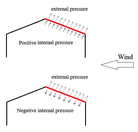 Accordingly, for each wind direction (wind from the left, right, back, and front), two load cases are required, representing internal pressure acting toward and away from the interior surfaces (i.e., positive and negative internal pressure).