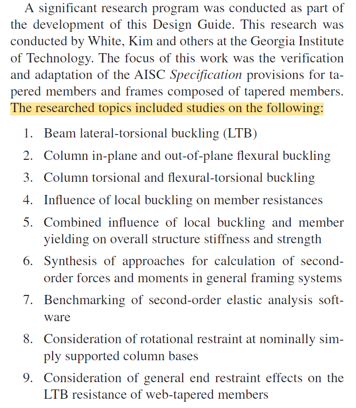The AISC Design Guide Frame Design Using Web-Tapered Members [1], published by the American Institute of Steel Construction, is based on the AISC Specification for Structural Steel Buildings. It provides guidance on applying the Specification’s provisions to the design of web-tapered members and frames composed of web-tapered members. A significant research program was conducted as part of the development of this Design Guide. This research was conducted by White, Kim and others at the Georgia Institute of Technology.