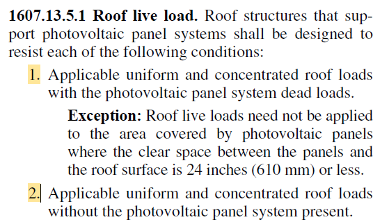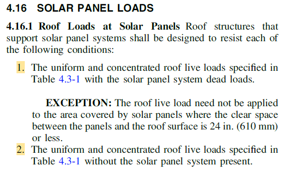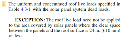 - 1- The uniform and concentrated roof live loads specified in Table 4.3-1 with the solar panel system dead loads. (EXCEPTION: The roof live load need not be applied to the area covered by solar panels where the clear space between the panels and the roof surface is 24 in. (610 mm) or less.)