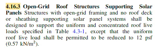 Note: Section 4.16.1 may be misinterpreted to mean that (1) the roof live load need not be applied over the area covered by solar panels, and (2) roof live load is applied only to the portions of the roof not covered by the solar panels. Under this interpretation, one might conclude that if the entire roof is covered by solar panels, no roof live load needs to be applied anywhere. However, Section 4.16.3 clearly states that roof structures supporting solar panels shall be designed for roof live load (where applicable, permitted to be reduced to not less than 12 psf). Therefore, the above conclusion and interpretation is not valid.