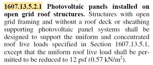In the section Open-Grid Roof Structures Supporting Solar Panels of ASCE 7-22 [1], which is similar to Section 1607.13.5.2.1 of IBC 2024 [2], it is stated that Structures with open-grid framing and no roof deck or sheathing supporting solar panel systems shall be designed to support the uniform and concentrated roof live loads specified in Table 4.3-1, except that the uniform roof live load shall be permitted to be reduced to 12 psf (0.57 kN/m2).